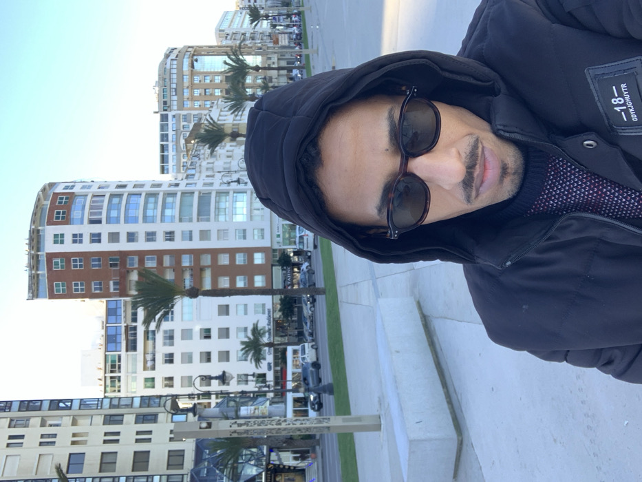A man wearing a black hooded jacket and sunglasses poses in an urban setting. Tall buildings with palm trees line the background. The man sports a mustache and a patterned sweater. A concrete ledge is in the foreground. The overall scene has a casual, outdoor feel. A label is visible on the jacket's sleeve.