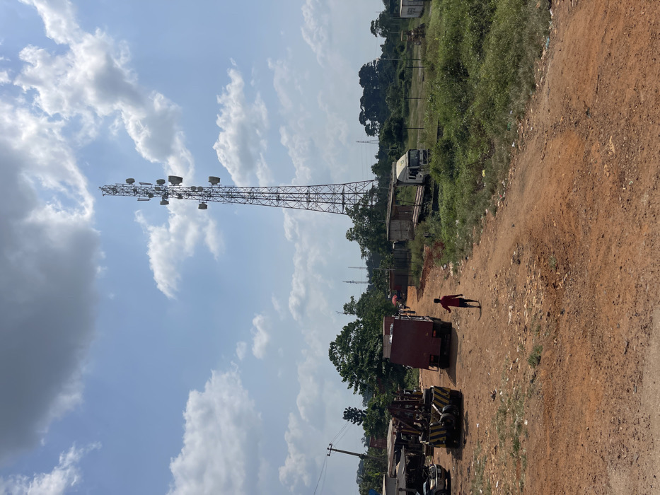 The scene in Oko-Eko, Nigeria, depicts an unpaved, reddish-brown dirt road under a clear sky with scattered white cumulus clouds. A tall metal lattice telecommunications tower, equipped with multiple dish antennas and ancillary equipment, dominates the right half of the frame, extending into the sky. In the foreground, a single individual, appearing male, dressed in a red short-sleeved shirt and dark shorts, walks away from the camera on the dirt road, roughly center-left. To the immediate left of this individual, a large red box truck is parked, facing away from the camera. Further left, a yellow and black heavy-duty vehicle, consistent with a tow truck or mobile crane, is stationary. Beyond these vehicles, several low-rise structures, possibly stalls or workshops, are visible, along with a utility pole supporting overhead lines. To the right of the walking individual and the dirt road, an open, unkempt grassy area with sparse vegetation contains a white flatbed truck parked on a small elevated platform. Further in the background, another piece of yellow heavy machinery, possibly an excavator or bulldozer, is partially visible. A line of green trees forms a distant horizon, and several large metal electricity pylons are discernible against the background sky. The overall environment appears semi-rural or industrial.