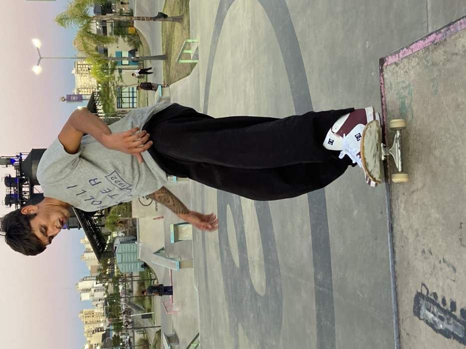 - "A young man skateboarding in a skatepark, wearing a gray t-shirt and black pants, his right hand slightly raised" by FM-faLbl2, licensed under CC BY 4.0