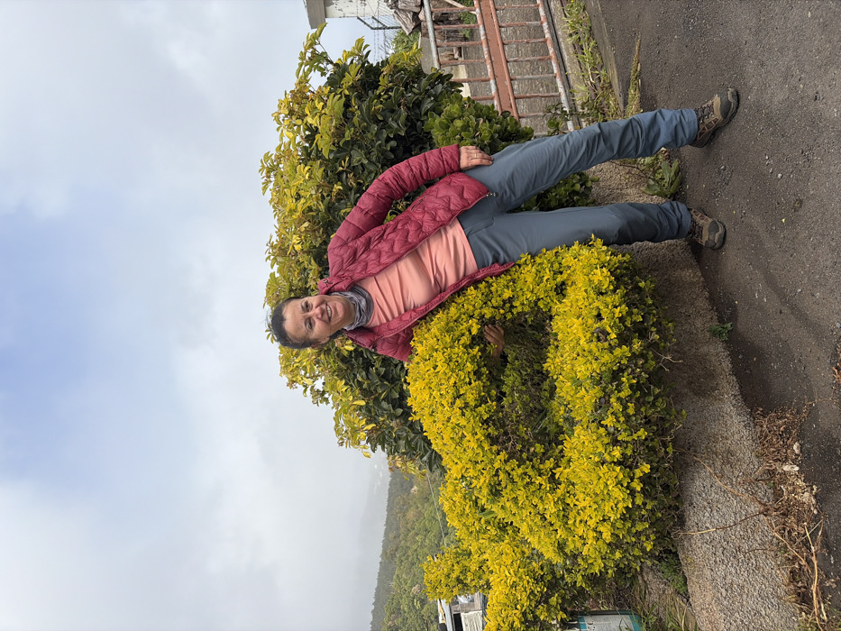 **Location:** Santa Cruz, Portugal. The image depicts a female individual standing outdoors on a paved surface, leaning against a large bush, under an overcast sky. **People:** A female subject, appearing middle-aged, is positioned slightly right of center. She has dark hair pulled back and a discernible smile. She is dressed in a maroon quilted jacket, unzipped over a peach-colored long-sleeved shirt, and wears a grey and white patterned neck gaiter. Her lower attire consists of dark grey or slate blue trousers and dark hiking shoes with lighter soles. Her right hand is partially obscured by foliage as she leans into the bush, adopting a relaxed posture with her body angled slightly towards the camera. **Subjects and Objects:** In the foreground, a dense, low-lying bush with bright yellow-green leaves forms a curved structure, serving as a support for the subject. Behind this, a larger bush with darker green foliage is present. A grey concrete curb or retaining wall supports the yellow-green bush. The ground in the immediate foreground is dark asphalt or paved material. To the right, a section of a reddish-brown metal gate or fence is partially visible. To the far left, a small, multi-material structure, including corrugated metal, is partially visible. The background reveals a descending landscape of densely vegetated hills under a cloudy, pale blue-grey sky. Distant structures are faintly visible within the hilly terrain, obscured by atmospheric haze. **Actions and Interactions:** The female subject is posing for a photograph, smiling and leaning casually against the yellow-green bush. No other individuals or active interactions are depicted within the frame. The scene documents a static, posed moment.