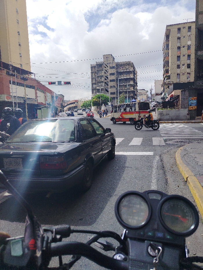 The image captures an urban street intersection in Los Teques, Venezuela, from the first-person perspective of a motorcycle