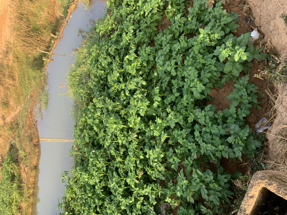 A vibrant green field of potato plants thrives alongside a narrow waterway