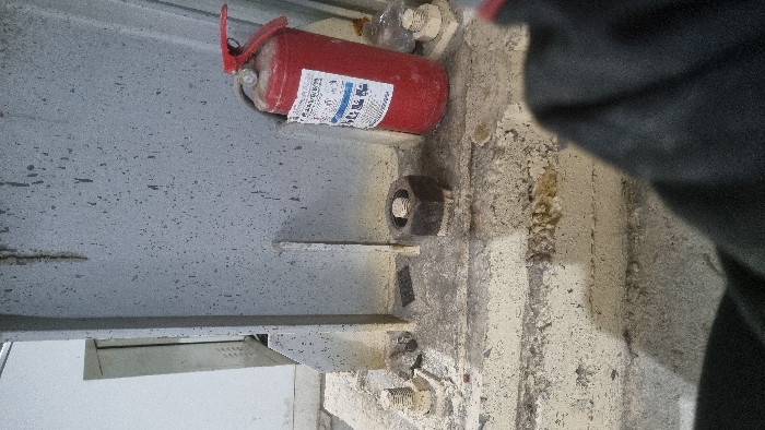 A red fire extinguisher is mounted to a gray, speckled I-beam. A large nut is visible below the extinguisher, secured on a bolt protruding from the beam. More bolts secure the I-beam to the adjacent concrete structure. The area is dusty and appears to be in an industrial or construction environment. The right portion of the image is obscured by a dark, blurry object.