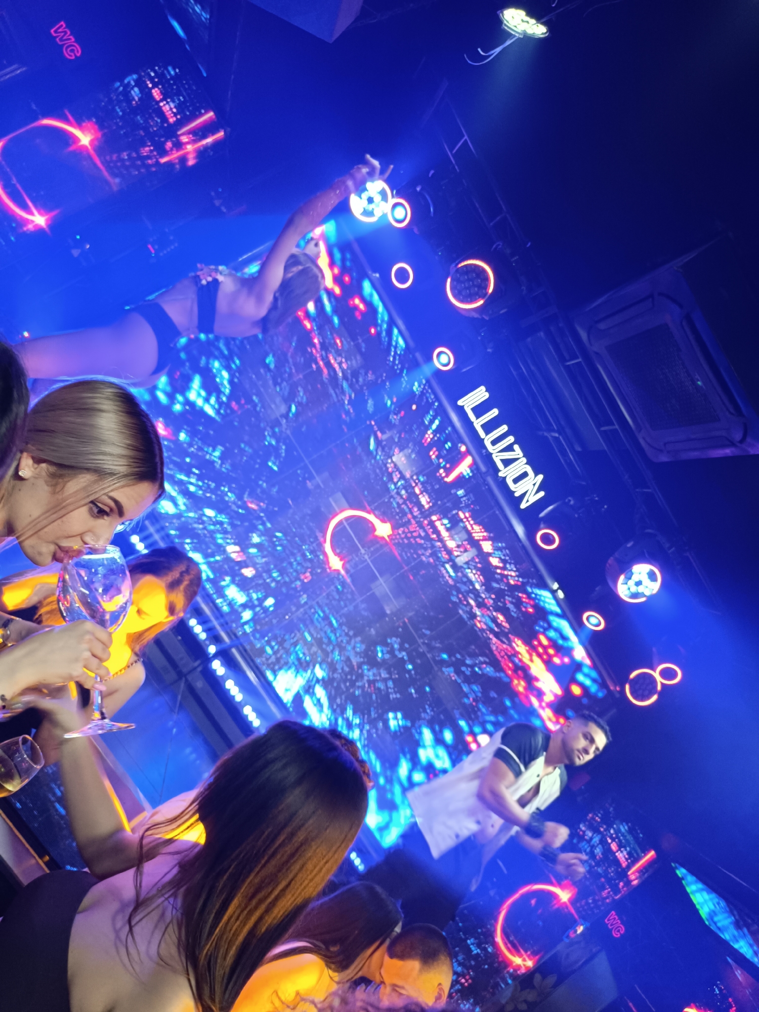 The image depicts an interior view of Illuzion Club, located in Sofia, Bulgaria. The scene is dominated by vibrant blue and red neon lighting, emanating from various fixtures and large LED screens that display dynamic, abstract digital patterns. In the upper-mid section of the frame, a female performer, dressed in a dark two-piece garment, is visible in an aerial pose, either suspended or on a raised platform, with her arms extended. In the mid-foreground, a female patron with light-colored hair is captured in profile, drinking from a clear stemmed glass. Another female patron, with long dark hair, is partially visible in the lower foreground, seen from behind. To the right, a male individual, wearing a white sleeveless top with dark sleeves, stands with his arms raised, possibly acting as a DJ or performer. The club's name, "ILLUZION," is prominently displayed in neon letters on a background structure. A red neon "WC" sign is also visible on a dark wall section. The overall environment is dark, suggesting a nightclub setting, with multiple partially visible individuals indicating a crowded social gathering.