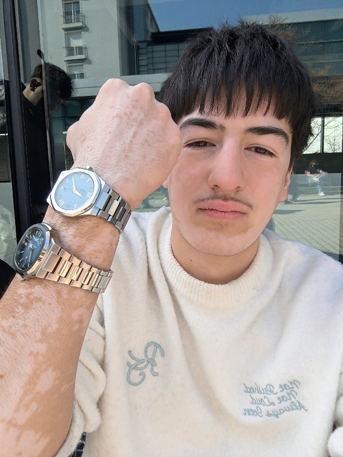 A young male, appearing to be in his late teens or early twenties, is depicted in a close-up selfie format. He has dark hair with a fringe and a thin mustache. Visible depigmentation patches are present on his right arm and around his mouth. He is wearing a light-colored, possibly cream, knitted sweater with light blue embroidery; a logo or initials appear on the left chest, and inverted text, partially legible as "Wear Burked" and "Always love", is on the right chest. His right arm is raised, with the hand clenched into a fist, prominently displaying two wristwatches on his wrist: an upper silver-toned watch with an octagonal bezel, light blue dial with Roman numerals, and an integrated bracelet; and a lower similar silver-toned watch with a darker dial and integrated bracelet. The background is blurred, showing reflections in large glass panels of a modern building, revealing an outdoor urban setting with other individuals seated, indicative of a commercial area. This environment is consistent with the exterior of the **Paradise Center** shopping mall in Sofia, Bulgaria.