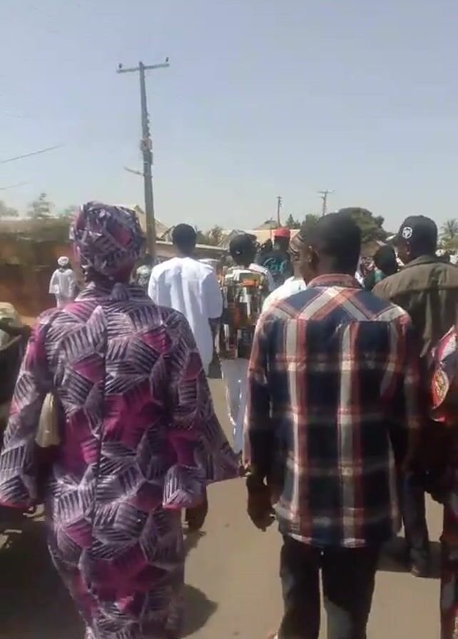 group of people walking down a street on a sunny day. The camera is positioned behind the people, capturing their backs as they move forward. Most of the people are dressed in casual clothing, with a few wearing traditional African attire. The street appears to be in a residential area, with houses and utility poles visible in the background. A motorcycle is parked on the side of the road. There is a sense of community and togetherness as the people walk side by side.