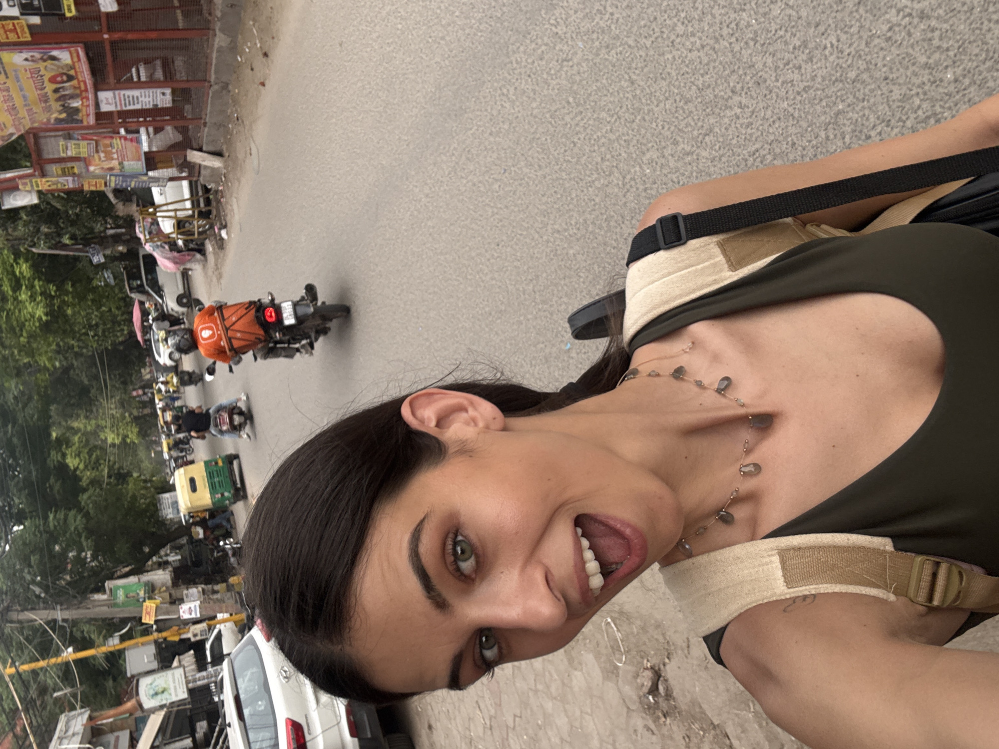 A female subject, appearing to be in her 20s-30s, occupies the foreground of this selfie-style image. She has dark hair pulled back, green eyes, and an open-mouthed expression directed towards the camera. She wears a dark olive-green tank top, a necklace with multiple grey, teardrop-shaped beads, and the light-colored straps of a backpack are visible over her shoulders. A faint tattoo is present on her upper left arm. The background depicts a busy urban street in Delhi, India. This identification is supported by the visible green and yellow auto-rickshaw, Hindi script on various signs and advertisements, and the "DL 5D AA 5822" license plate on a passing motorcycle, indicating Delhi registration. The asphalt road shows signs of wear and dirt. Vehicles populate the street, including a motorcyclist in an orange uniform with a large orange delivery bag, heading away from the camera. Other motorcycles, cars, and the aforementioned auto-rickshaw are visible further down the road. On the left, a white Hyundai Creta SUV is parked alongside a row of buildings with storefronts and prominent utility poles laden with numerous wires. The right side of the street features a red-painted metal fence or gate densely covered with various posters and advertisements. The scene is illuminated by bright daylight, suggesting an outdoor setting in a densely populated area.