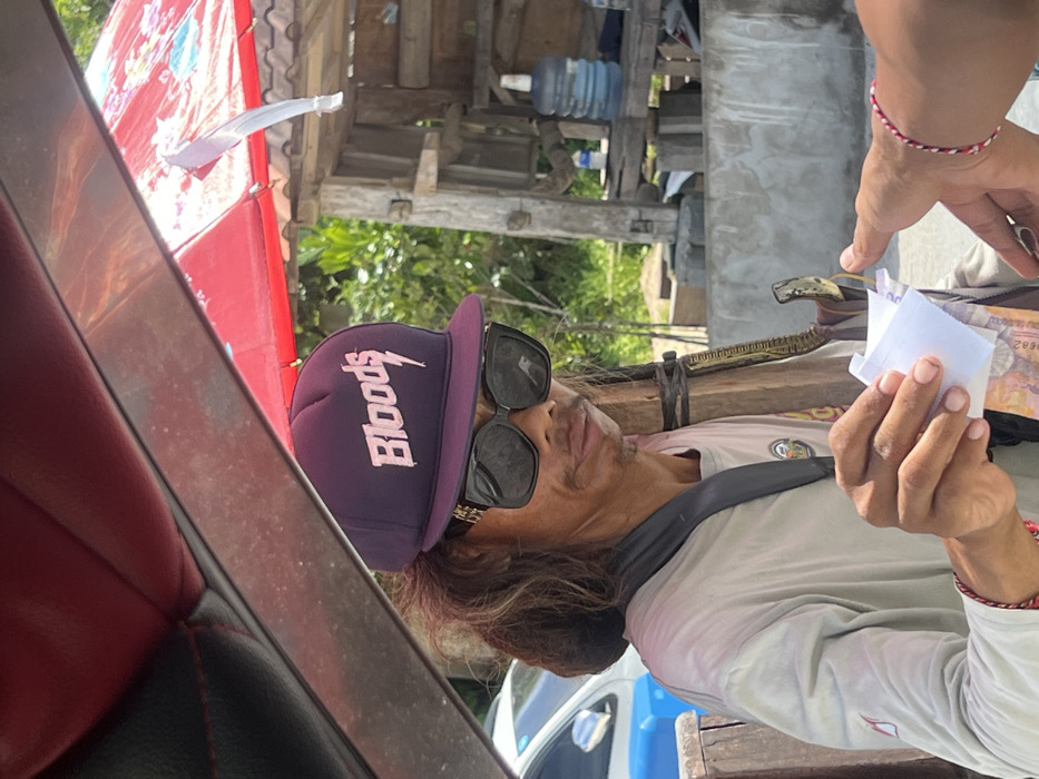An outdoor scene in Pejukutan, Indonesia, captures a transactional interaction between two individuals. The central figure, an adult male, is depicted from the chest up, wearing a dark purple baseball cap with a light-colored "Bloods" logo and a lightning bolt emblem, dark rectangular sunglasses, and a light-colored long-sleeved shirt. He has light brown, medium-length hair and a mustache. His right hand holds several folded white paper squares and multiple Indonesian Rupiah banknotes, including a visible 5000 Rupiah note. A second individual's right forearm and hand extend into the frame from the right, positioned for an exchange with the central figure. Both individuals wear matching red, white, and black braided bracelets on their right wrists. The background includes a rustic wooden structure with a red canopy overhead, housing a large blue plastic water dispenser bottle. Green foliage is visible beyond the structure, and a partial view of a blue and white vehicle is present on the far left. The image is framed from within a vehicle, showing red interior trim at the top.