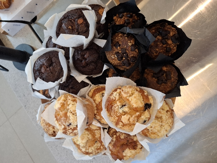 - "The image displays an overhead view of a diverse selection of muffins arranged on a metallic, reflective display counter within a commercial establishment in Bnei Dror, Israel" by FM-B2gbf2, licensed under CC BY 4.0