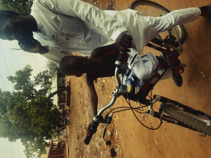 The image depicts an outdoor scene in Akwanga, Nigeria. An adult male and a young child are positioned around a mountain bicycle on reddish-brown dirt ground. The adult male, with dark skin and a beard, is wearing a white long-sleeved traditional garment and a dark cap. He stands behind the bicycle, supporting it, and holds a black mobile phone to his right ear, suggesting he is engaged in a call. A young child, appearing to be 3-5 years old, with dark skin, is seated on the crossbar of a dark-colored mountain bike with front suspension, gripping the handlebars. The child is wearing white trousers and dark shoes; the upper body appears bare or in a very dark, minimal garment. In the background, several single-story residential buildings with light-colored walls and corrugated roofs are visible, interspersed with large trees featuring green foliage. A motorcycle is parked in the mid-left background near one of the buildings.