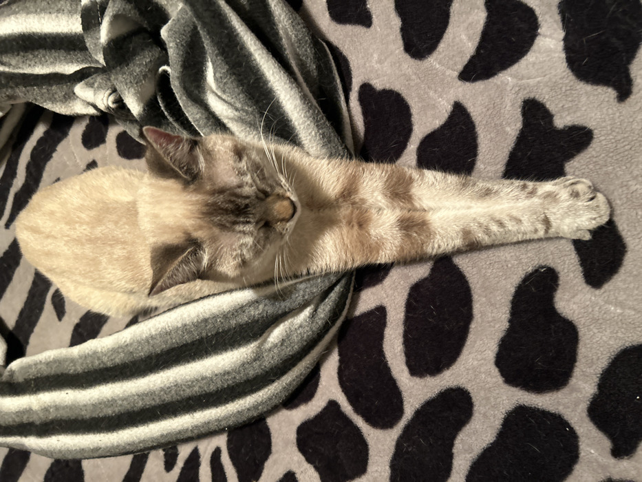A tan and gray lynx point cat sleeps on a blanket. The cat is stretched out, its body curled slightly while one front leg extends fully. The blanket below has a gray and black cow print pattern, with a striped gray and black fleece scarf wrapped around the cat. The cat's face is nestled down, eyes closed, blending with the gray stripes. The overall scene is peaceful and cozy.