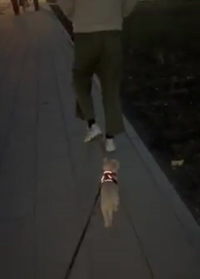 A man is walking a small, light-colored dog on a leash down a paved sidewalk. The man is wearing a light-colored hooded sweatshirt, khaki pants, and white sneakers. The dog is wearing a red harness. The sidewalk is made of gray rectangular pavers. To the right of the sidewalk is a dark area of dirt or grass. In the background, there are people walking in the distance and a large building with yellow and purple panels. The sky is dark, suggesting it is either dusk or nighttime. There are streetlights illuminating the scene. The camera follows behind the man and the dog as they walk.