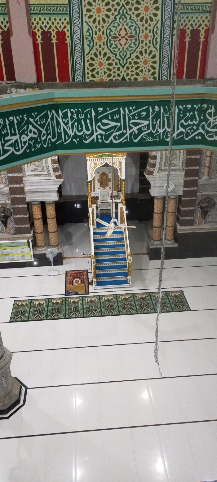 An interior shot of a mosque reveals a raised pulpit with blue carpeted steps. Green prayer rugs line the tiled floor leading to it. Ornate Arabic calligraphy borders the upper section of the mosque. Pillars with detailed ornamentation flank the pulpit's entrance. A ceiling fan hangs nearby. A hanging chain and the top of a pillar are visible at the bottom edges of the image.