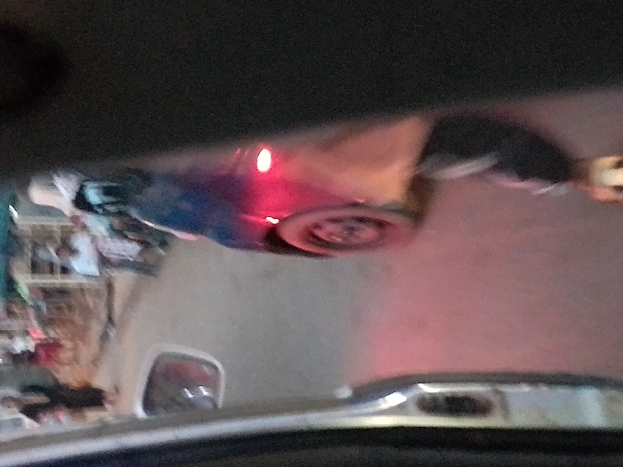 Inside a car, a blurry scene unfolds through the windshield. A vehicle with a prominent wheel is reflected in the glass. A red light, possibly a brake light, is visible on the reflected vehicle. Outside the car, a building is partially visible. The car's dashboard and rearview mirror frame the bottom of the image. The overall image is blurry and lacks sharpness.