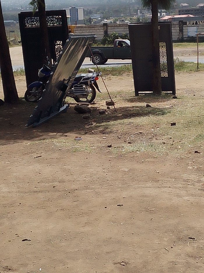 The image displays an outdoor scene under bright daylight. The foreground consists of reddish-brown dirt ground with sparse dry grass patches and scattered small rocks. In the midground, two dark, ornate metal gate panels stand vertically, each positioned next to a dark tree trunk. Between these, a large, reflective metallic panel, possibly corrugated, leans against the left gate panel and is propped up by a thin stick anchored by rocks, forming an angled cover or structure. Two motorcycles are situated near this structure: a blue motorcycle is partially visible to the left, and a dark-colored motorcycle with a rear luggage rack is visible to the right. In the mid-background, a paved road runs horizontally. A dark green pickup truck, with a visible driver, is in motion on this road, proceeding from left to right. Behind the road, a light-colored concrete wall is visible, bearing partial white text reading "RIFT VAL." The far background reveals various buildings and distant hills under a clear sky. No individuals are observed interacting with the gates, metallic panel, or motorcycles. The described location is the City of London ward, Kenya.