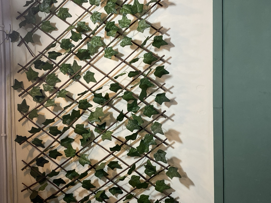 A wall section is depicted, horizontally divided into a dark green lower portion and an off-white upper portion. An expandable wooden lattice, brown in color and configured in a diamond pattern, is mounted on the off-white wall. Artificial green ivy leaves are sparsely woven through the lattice. Shadows from the lattice and leaves are cast onto the off-white surface, consistent with overhead illumination. A light-colored pipe or conduit runs along the top edge of the frame. No individuals, actions, or interactions are present. The precise location within Chimbote, Peru, cannot be determined from the visual evidence provided.