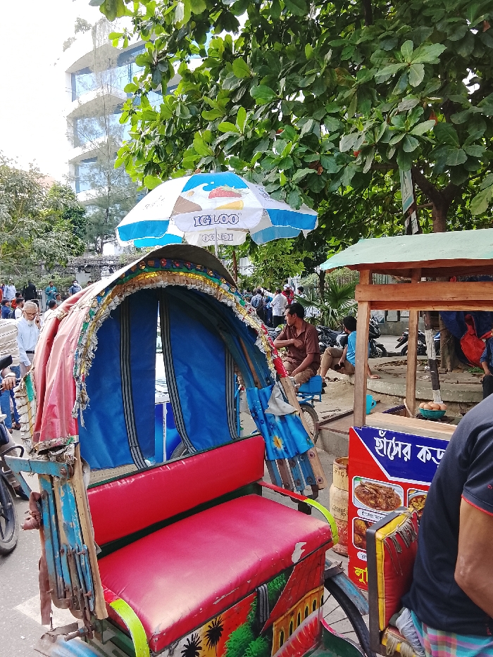The image depicts a vibrant street scene in Dhaka, Bangladesh, centered around a traditional rickshaw. In the immediate foreground, a three-wheeled pedal rickshaw is prominent, featuring red padded vinyl passenger seats and a blue canopy adorned with multi-colored, somewhat frayed decorative trim. The side of the rickshaw displays folk art, including a painted building. In the mid-ground, under the shade of lush green trees, an open white and blue "IGLOO" branded umbrella is visible. Beneath the umbrella and trees, several adult males are present. One man in a light brown shirt is seated on a small blue stool or low seat. Another man in a light blue shirt sits further back. To the left, a man in a light-colored shirt is seen looking at a mobile phone. On the far right, the back of a man wearing a dark blue t-shirt and plaid shorts partially obscures a food stall. This stall features a wooden frame, a light green roof, and a vertical red and blue sign displaying images of prepared food and Bengali text, including "হাঁসের মাংস" (Duck meat/curry). A small green container with eggs is visible on the stall's counter. In the background, a modern multi-story building with reflective glass windows is partially visible against a bright sky, positioned behind the trees. The ground appears to be a paved surface, and parts of other vehicles, possibly a motorcycle or scooter, are visible on the left. The scene suggests typical daily activity on a bustling street or market area within Dhaka.