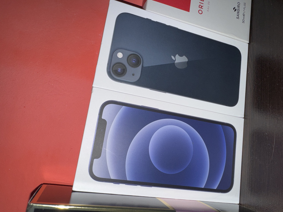 The image depicts an indoor scene with several retail product boxes arranged on a dark brown surface against a solid red background. Two white rectangular boxes, identified as Apple iPhone packaging, are centrally positioned. The left box displays the front of a blue iPhone with a notch and a blue circular wallpaper. The adjacent middle box shows the rear of a dark blue iPhone, featuring a diagonally arranged dual-camera system, a flash, and a central Apple logo. To the immediate left of the iPhone boxes, a portion of a reflective, metallic object with gold tones is visible. To the right, a segment of a white box with red text is present, revealing "ORIE" (likely "ORIENTAL"), "EAU DE PARFUM," and "SANSIRA 50ml e 1.7 FL.OZ.", consistent with perfume packaging. The objects rest on a dark brown surface, possibly wood, which exhibits a subtle sheen. The background is a uniform red, appearing to be a wall or display panel. No individuals are present, and no actions or interactions are occurring. The specific location within the city of Cherven Bryag, Bulgaria, cannot be determined from the visual information provided.