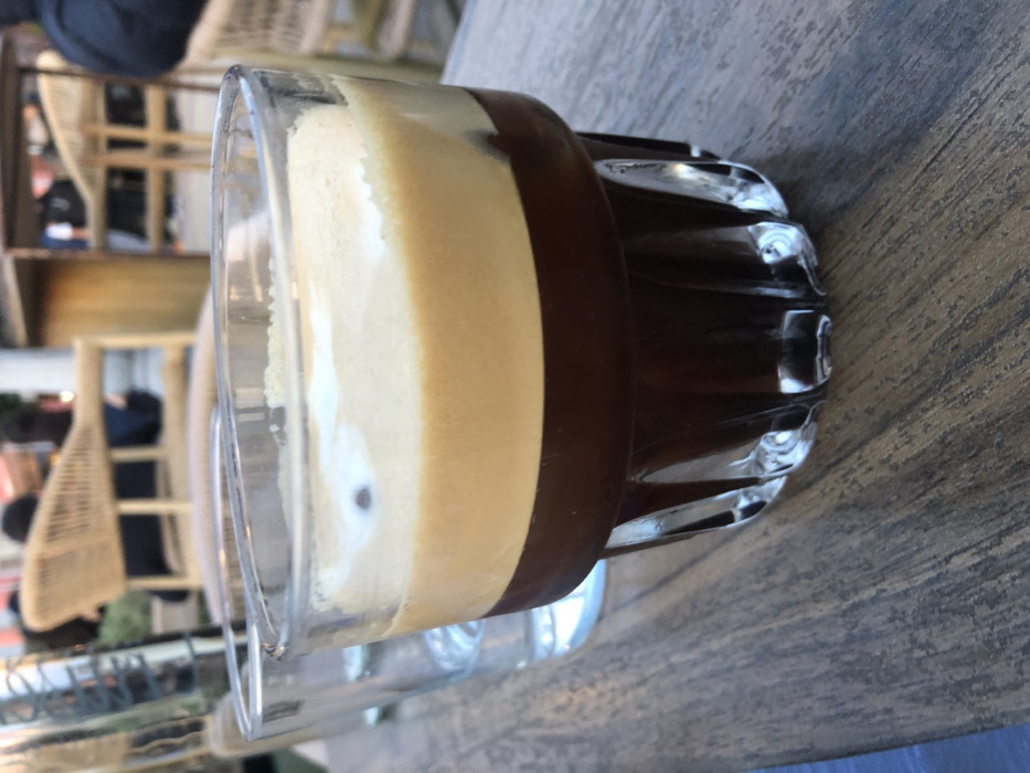 A glass of iced coffee with a layer of foam on top sits on a wooden table in a cafe in Paleo Faliro, Greece