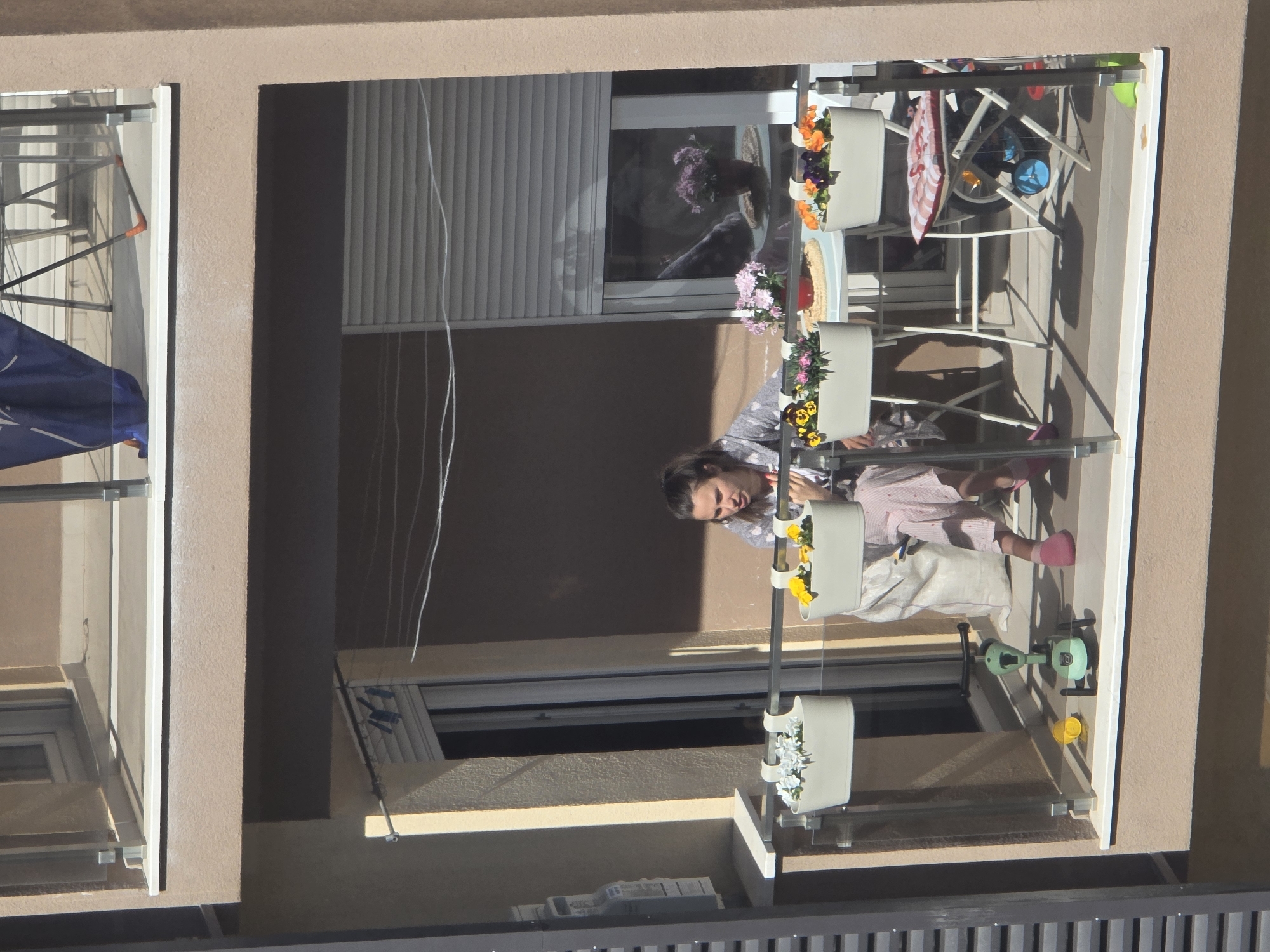 balcony on a building, likely in Podgorica, Montenegro, based on the architectural style and local flora. A woman is leaning over the balcony railing, wearing a light-colored, patterned top and pink striped pants. She appears to be looking down. The balcony is decorated with three white planters containing flowers of various colors. In the background, there is patio furniture, including a table and chairs. A clothesline is strung across the balcony. The blinds are partially closed in an adjacent window. Below the balcony is another balcony with a window. Below the window is a metal grate.