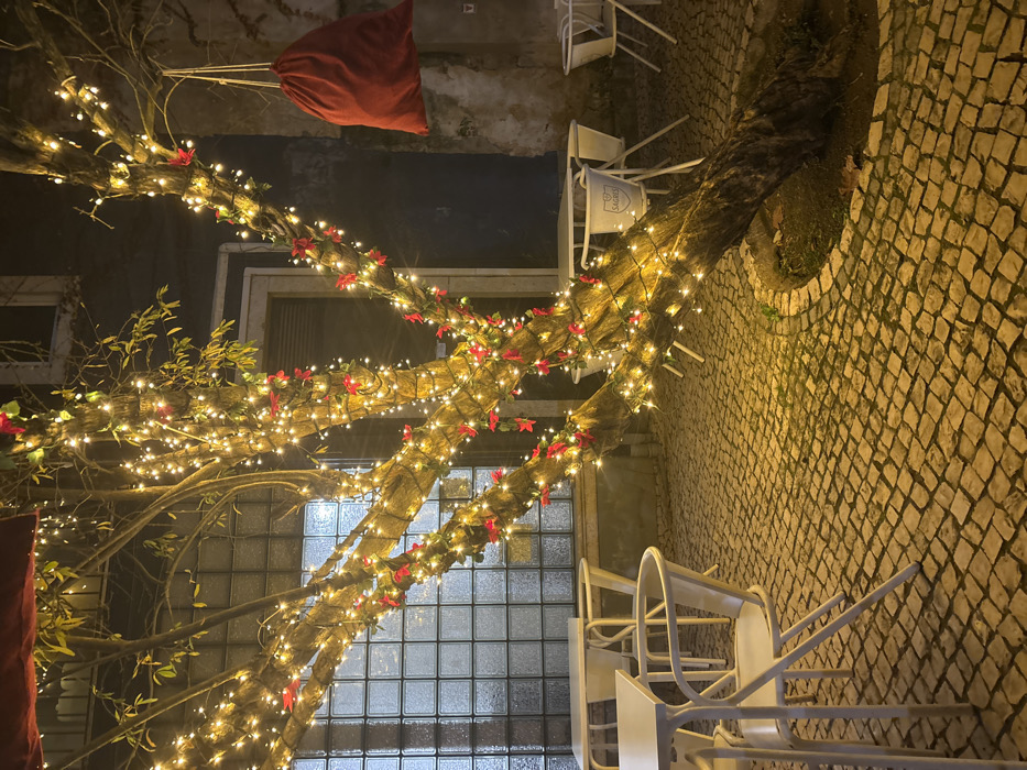 A nighttime scene features a tree heavily decorated with small, warm lights and red bows. The tree’s branches spread across the frame, partially obscuring a building with a grid-patterned window. Below the tree, several stacked white chairs and tables sit on a textured cobblestone ground. A red cloth bag hangs above the tree. The scene is dimly lit.