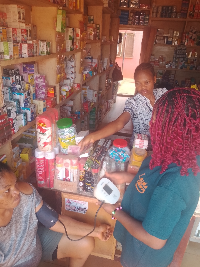The image depicts an interior scene of a retail establishment, likely a pharmacy or drug store, located in the city of Unknown, Unknown. The setting features light-colored wooden shelves lining the walls, densely packed with various packaged products, including boxes of what appear to be medications, health supplements, and toiletries. In the background, an open doorway reveals an outdoor area with a reddish-pink building facade and a window secured by horizontal bars. Three adult females are present. In the lower-left quadrant, a woman wearing a light gray short-sleeved top is seated. A dark blue blood pressure cuff is secured around her left upper arm. She is looking towards the right. Immediately to her right, and partially with her back to the viewer, another woman with reddish, tightly coiled braided hair, wearing a dark green short-sleeved top with a yellow emblem on the left chest, holds a white Omron digital blood pressure monitor in her left hand. This monitor is connected via a tube to the cuff on the first woman's arm, indicating a blood pressure measurement in progress. Her right hand is extended over a display counter towards the center of the frame. Behind this counter, standing and facing towards the right, is a third woman with dark hair styled in small braids, wearing a light-colored checkered or plaid short-sleeved blouse. Her right arm is extended over the counter, with her hand positioned near various items. The counter surface is crowded with an assortment of products, including several red aerosol cans, clear jars, and boxes, some explicitly labeled 'Passion' and 'Shaffilux'.