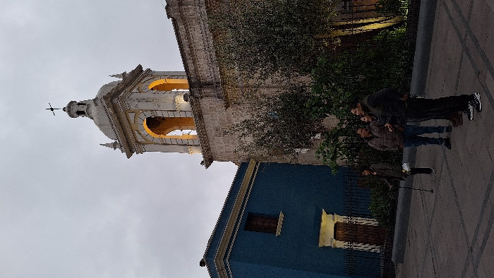 A low-angle shot captures a church with a tall, ornate bell tower topped by a cross, illuminated from within its arches. Adjacent is a blue building with gold trim. Three people stand on a paved area, appearing to converse. A fourth person, perhaps holding a cane, stands nearby. The sky is overcast, lending a muted tone to the scene.