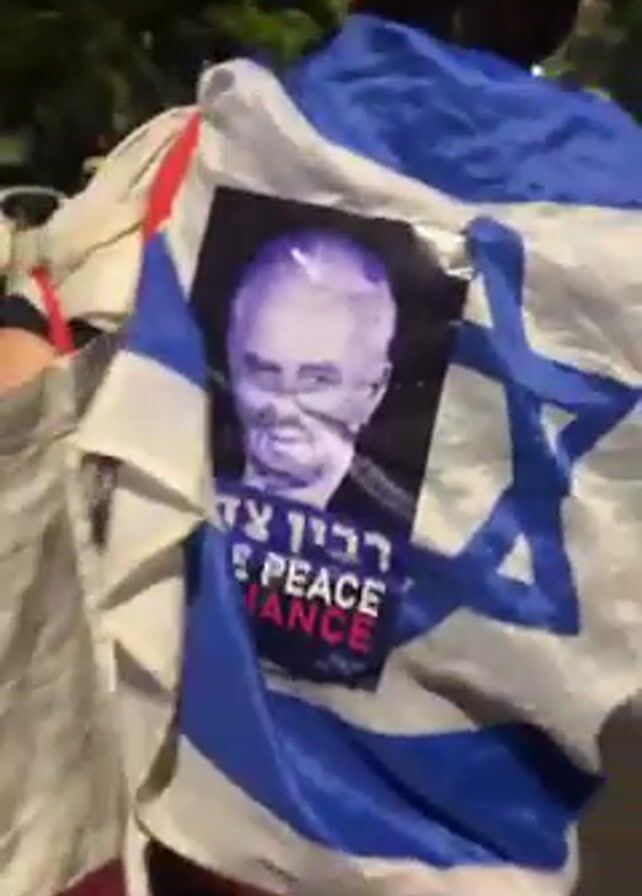 A person walks at night while wearing an Israeli flag like a cape. The flag has a portrait of an older man and the words “give peace a chance.” Other people walk by, some walking in the opposite direction. There are streetlights and trees in the background.