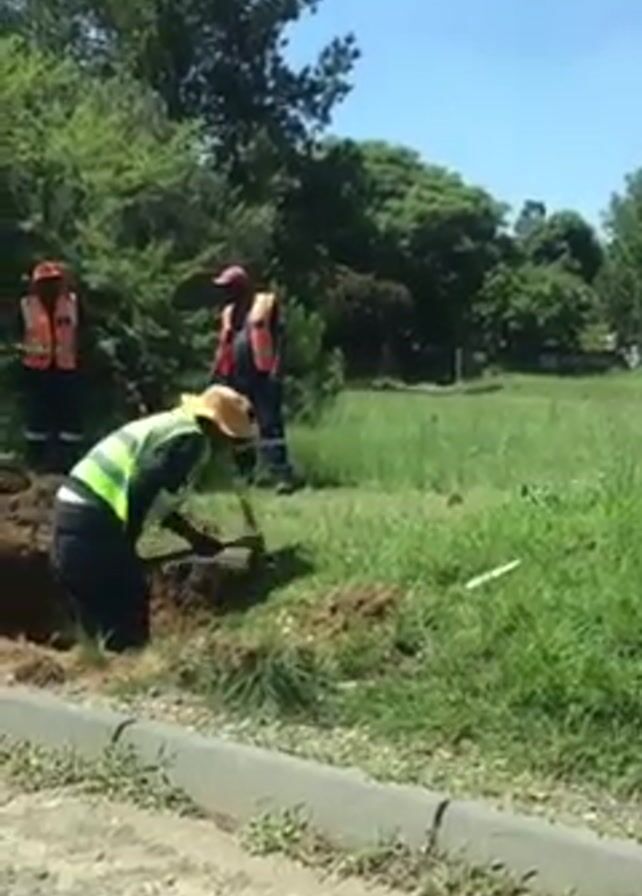 three workers near a roadside, next to a grassy field. One worker is actively digging into the ground with a shovel near the curb, while the other two stand behind, observing. All three are wearing high-visibility vests. The worker doing the digging has a hat. The area has a mix of trees and grass. The weather appears sunny.