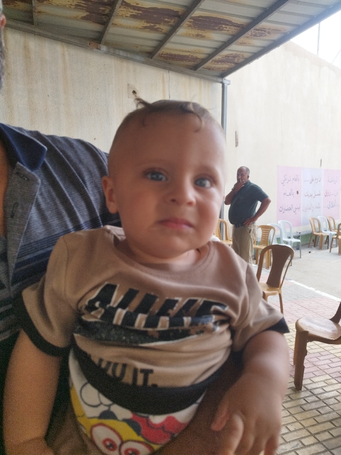 The image captures a scene in Idhna, Palestinian Territory, under a corrugated metal canopy. In the foreground, a light-skinned infant with blue eyes and light hair is prominently featured, held by an adult whose torso and left shoulder, clad in a striped dark shirt, are visible on the left. The infant wears a light brown long-sleeved shirt with "NIKE" in black lettering across the chest, and a colorful cartoon-patterned undershirt or bib is visible below. The child's gaze is directed forward. In the midground, to the right of the infant, a bearded adult male, wearing a dark green polo shirt and light-colored trousers, stands with his right hand raised near his chin and his left hand on his hip. He appears to be looking towards the left. Behind this man and extending across the midground are multiple rows of light brown and white plastic chairs arranged on a tiled surface. A white sheet or banner adorned with Arabic script is affixed to the light-colored wall in the background. The overhead corrugated metal canopy shows signs of rust. The ground is paved with rectangular tiles in shades of reddish-brown and tan.