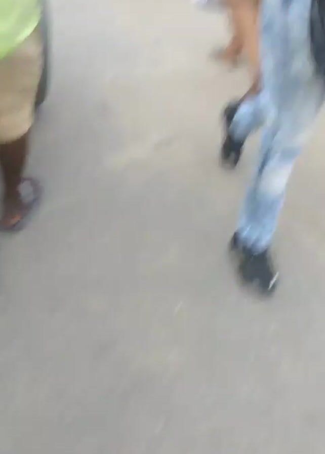 lower bodies and feet of people walking on a paved street. Most are wearing sandals or flip-flops, but a few have shoes on. There is litter on the ground. In the background, a yellow vehicle and a motorcycle are parked.