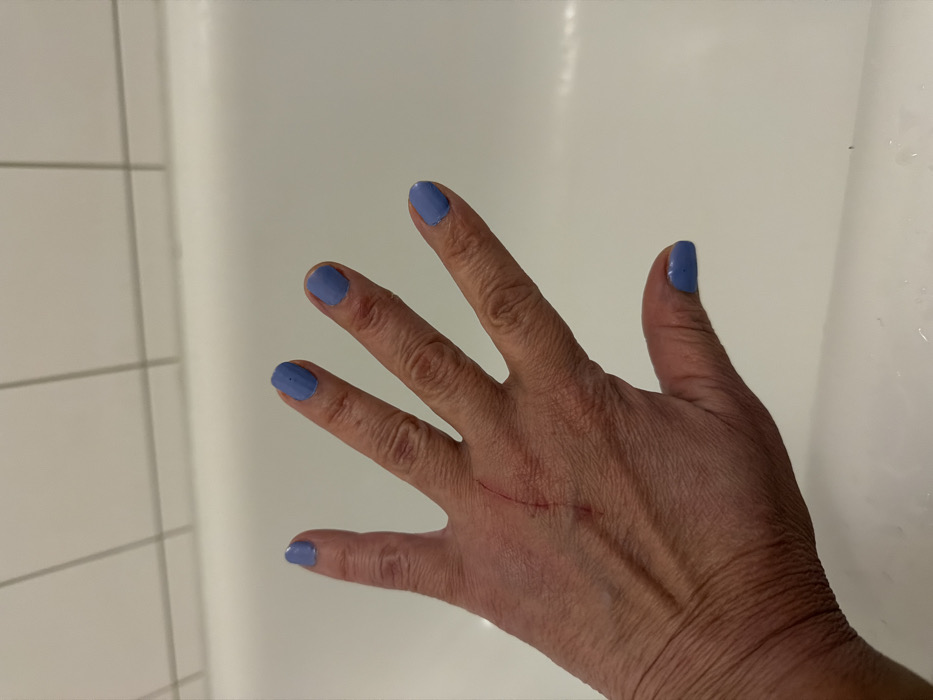 A woman's hand is displayed against a tiled white wall. Her nails are painted a light blue. A scar is visible on the back of her hand, running diagonally from the base of her middle finger towards her wrist. The hand's skin is wrinkled and shows veins, indicating age. The background is blurred and out of focus.