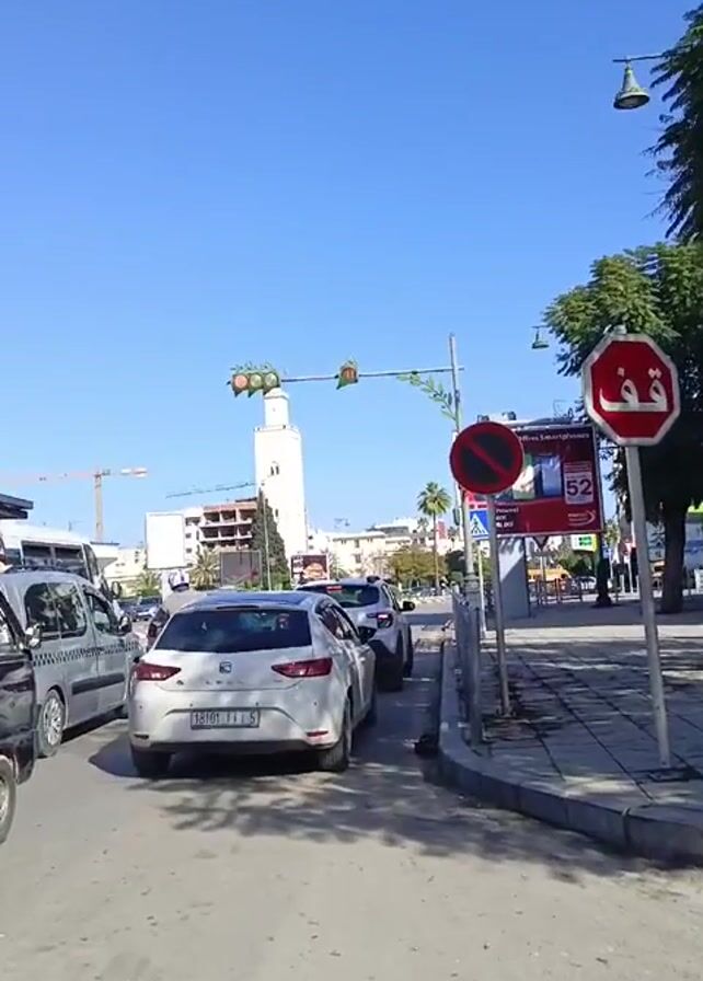 street scene with cars stopped at a traffic light in what appears to be a city in Morocco, given the Arabic script on the stop sign