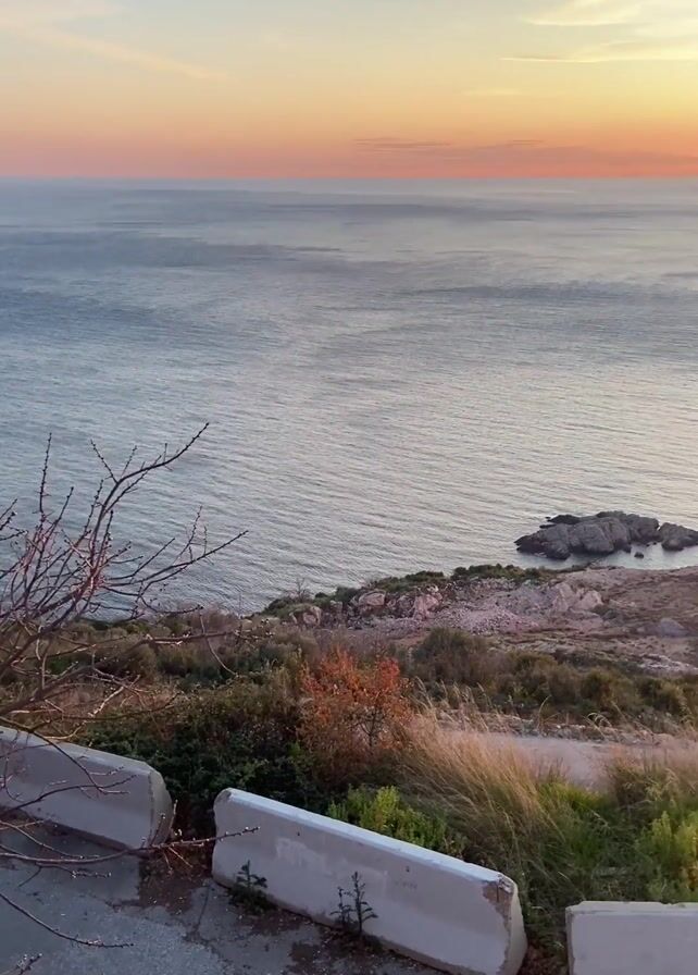 n eye-level view of a sunset over the ocean. The sun is visible above the horizon, casting a shimmering reflection on the water. The sky has a gradient of colors, transitioning from blue near the top to orange and pink near the horizon. The foreground includes a road with concrete barriers, along with vegetation such as grass and small bushes. A small rocky outcrop is visible near the coastline. The camera pans slightly to the right, revealing more of the coastline and the setting sun. A metal railing is visible on the right side of the frame.