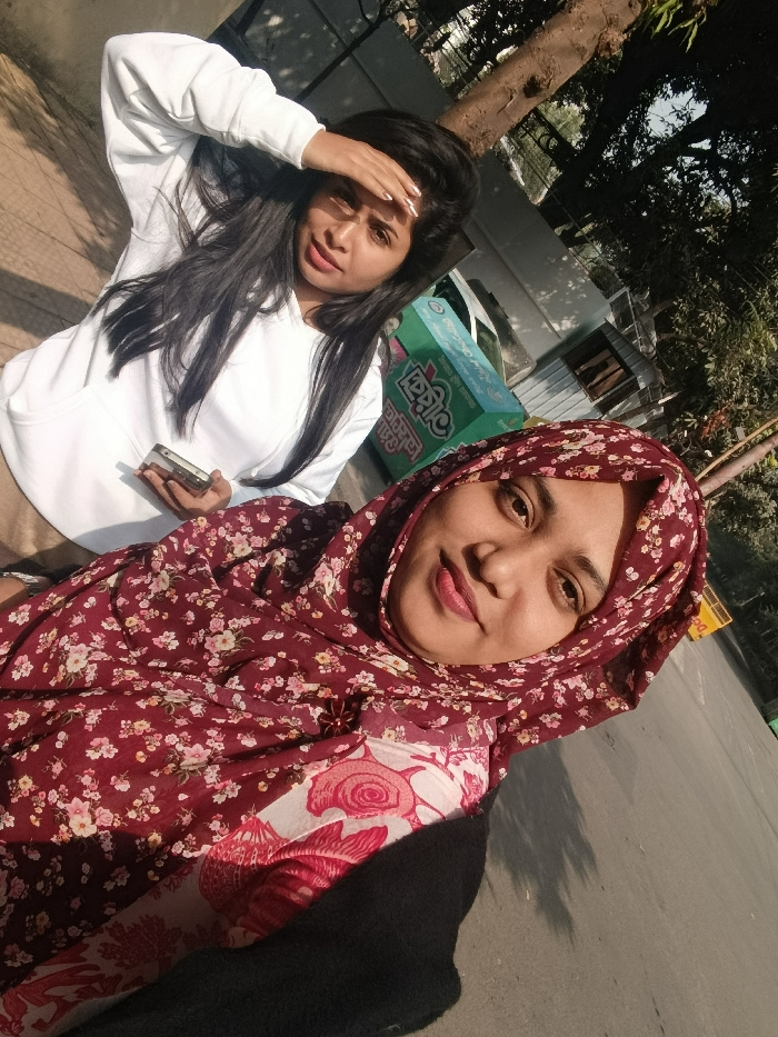 Two women pose for a selfie outdoors on a sunny day. The woman in the foreground wears a floral hijab, a white top with pink roses and a black sweater. Her skin is light brown and she has soft pink lips. Behind her, a woman in a white hoodie shields her eyes with her hand, holding a phone in her other hand. Her long black hair falls down her shoulders. There is a green container behind them and a tree.