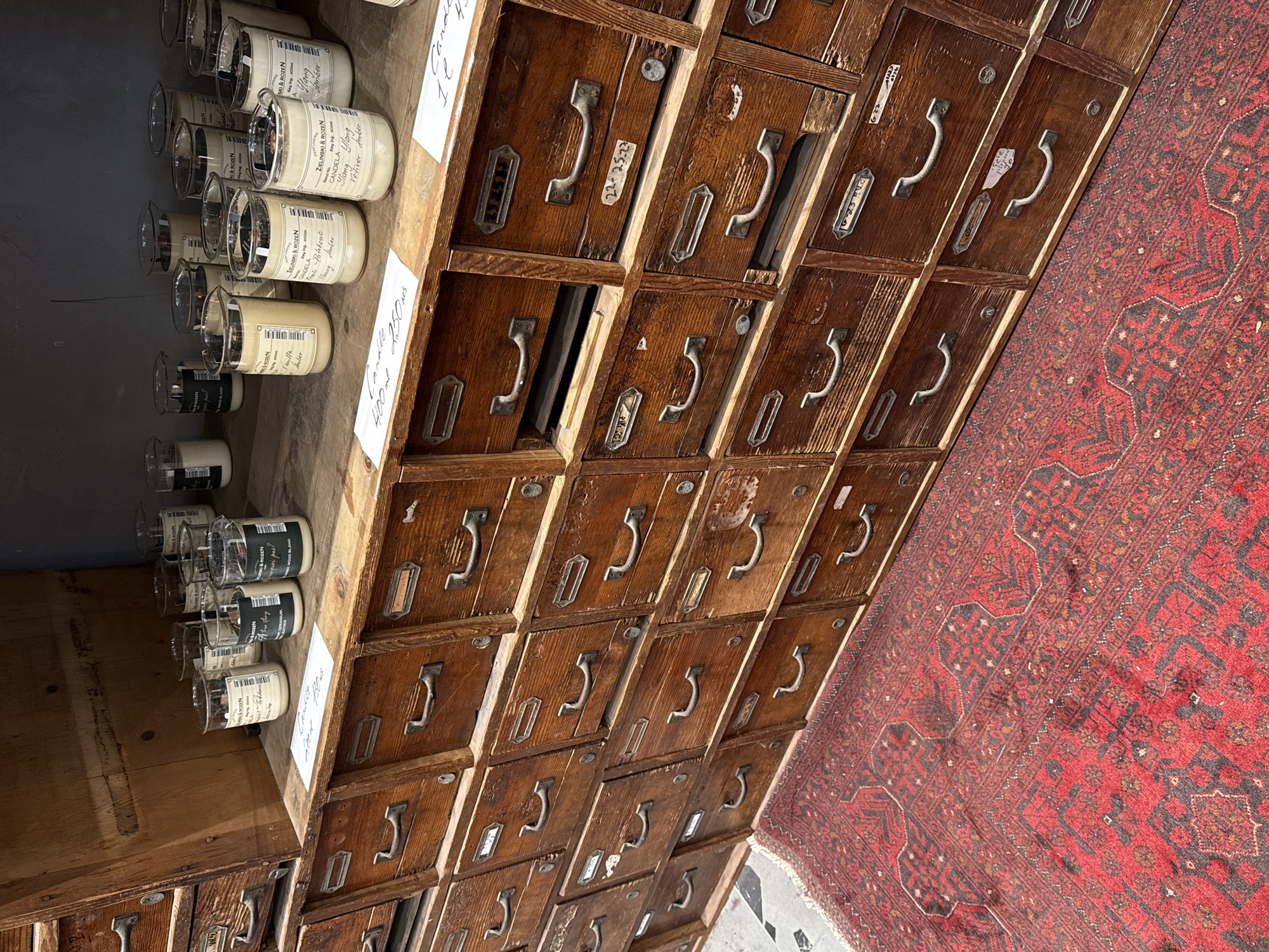 display of "ZELINSKI & ROZEN" candles, likely in a store in Tel-Aviv, Israel. The candles are arranged in rows on top of a wooden cabinet made of many drawers, each with a metal pull handle and label slot. The red rug is adjacent to the cabinet. A closer look at the labels on the candles reveals different scents like "Vanilla Amber," "Honey Amber," and "Ylang Vetiver Amber" are listed in the OCR.