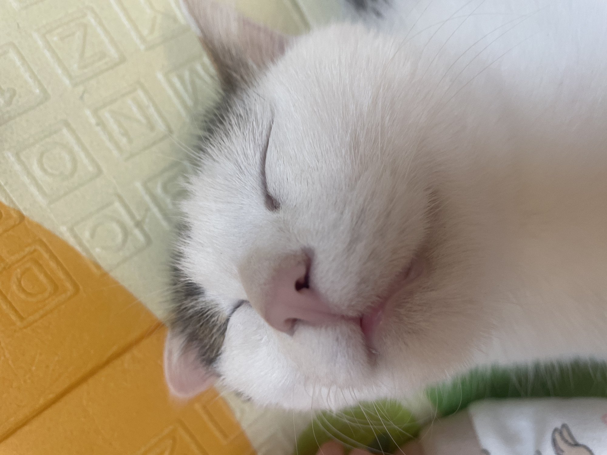 A close-up image depicts a domestic cat in a state of repose, reportedly located in Podstepki, Russia. The cat's head is the primary focus, positioned centrally within the frame. Its fur is predominantly white, with segments of grey and brown tabby markings visible on the top of its head and ears. Both eyes are closed, and its pink nose is prominent. The mouth is slightly open, revealing a pink lower lip and a small amount of liquid or saliva. White whiskers extend from the muzzle. The cat rests on a light beige or pale yellow textured surface featuring a grid pattern with embossed letters, including 'O', 'N', 'Z', and 'W', consistent with a puzzle or alphabet mat. To the upper left, an orange textured surface with a geometric 'D' shape is partially visible. On the lower left, a green textured surface is present, adjacent to a white fabric item, possibly clothing, bearing a faint brown graphic. A human finger or thumb, with fair skin, is partially visible on the far left, near the cat's neck area.