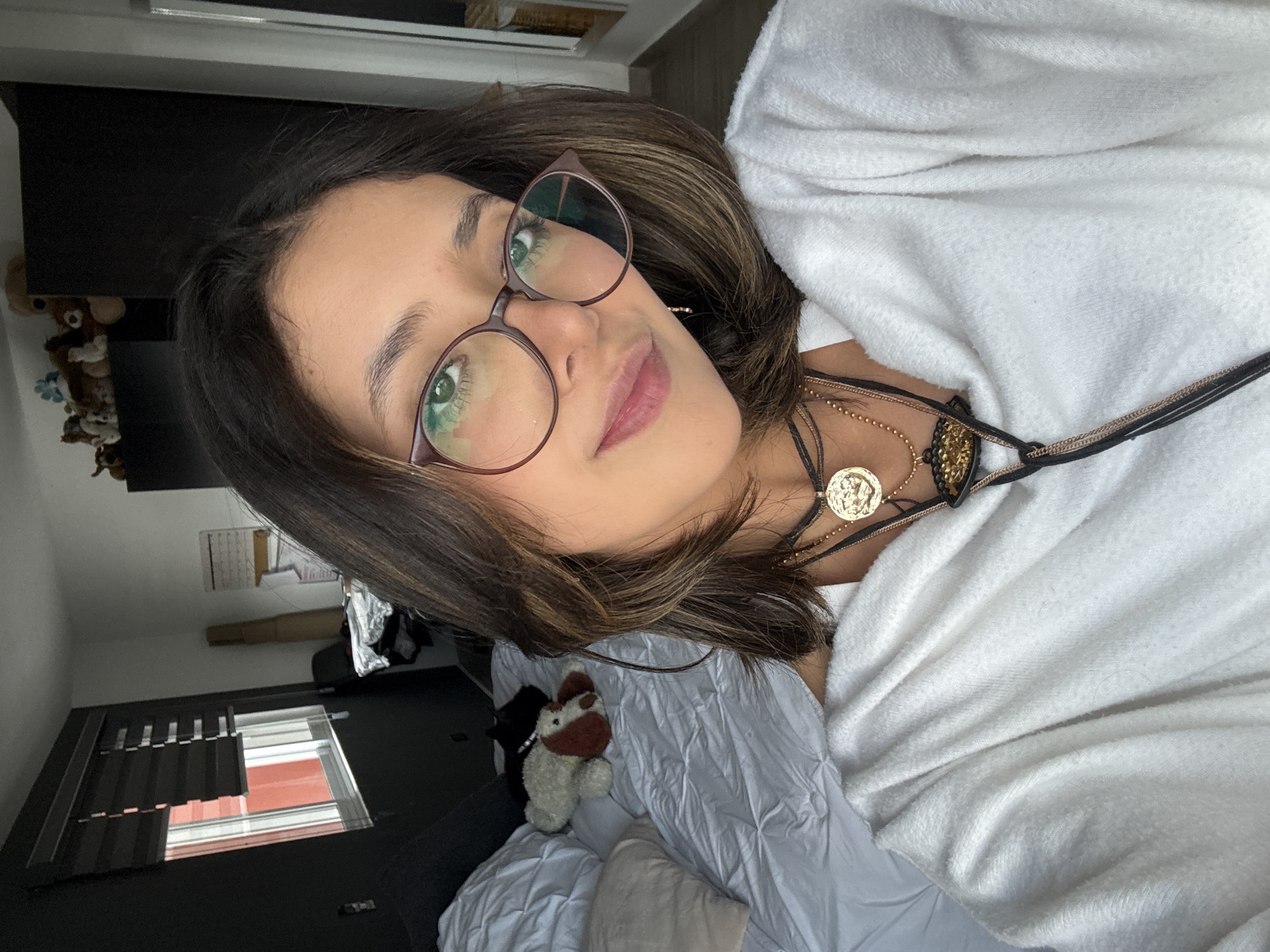 A female individual is captured in a close-up, chest-up selfie, looking directly at the camera with a subtle smile. She wears maroon-framed glasses that reflect green light, a white fuzzy long-sleeved top, and multiple layered necklaces including a gold-colored medallion on a black choker and a black cord with a dark, decorative pendant. Her dark brown hair, with lighter highlights, is styled in layers around her shoulders. The background reveals an indoor residential setting. To the left, a bed with a white textured duvet holds a light beige pillow and two stuffed animals: one white and brown, the other dark-colored. Beyond the bed, a dark grey wall features a window fitted with dark horizontal blinds, partially open to reveal a reddish-orange building exterior. To the upper right, a dark cabinet or wardrobe is visible, topped with several small stuffed figures. A white wall calendar is affixed to the adjacent white wall. The scene depicts an interior residential space consistent with an urban or suburban environment. The precise location within the city of Puebla, Mexico, cannot be determined from the visual evidence provided.