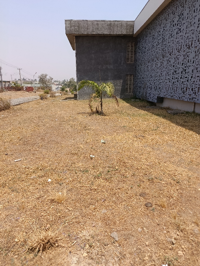 This image captures an outdoor scene in Rafin Pa, Nigeria, under a clear, bright sky. The foreground and midground are covered predominantly with dry, sparse, yellowish-brown grass and bare earth, interspersed with scattered white debris, possibly plastic or paper. A single, small palm-like plant with both green and withered brown fronds stands in the midground, casting a shadow to its left. To the right, a section of a modern building is visible. Its corner features a dark grey, rough-textured wall containing two vertical stacks, each with three rectangular louvered vents. Adjoining this, a lighter grey wall presents a repetitive geometric pattern of open rectangular perforations. The building has a flat roof with a slight overhang. In the background to the left, a dirt or gravel path extends into the distance, flanked by utility poles with overhead wires. A cluster of distant buildings with varying roof colors and sparse trees are visible, partially obscured by atmospheric haze. No individuals are present in the scene.