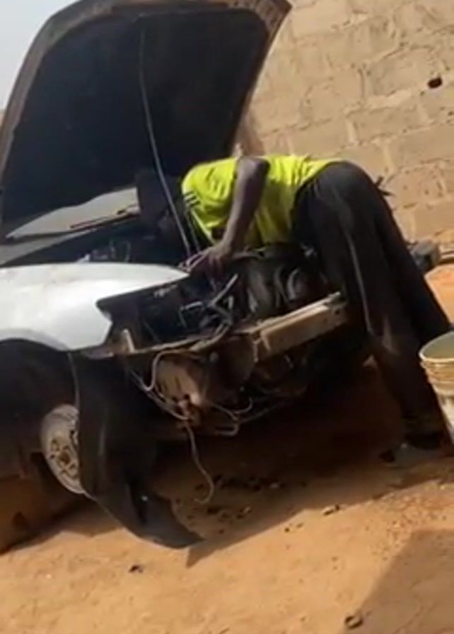 man working on a car engine. The car is white and appears to be quite old and damaged, with missing parts and rust. The hood is open, and the man is leaning over the engine compartment, seemingly working on the engine. He is wearing a bright yellow shirt and dark pants. The car is propped up on cinder blocks. The background consists of a brick wall and a few trees. The setting suggests a somewhat outdoor or semi-enclosed workspace.