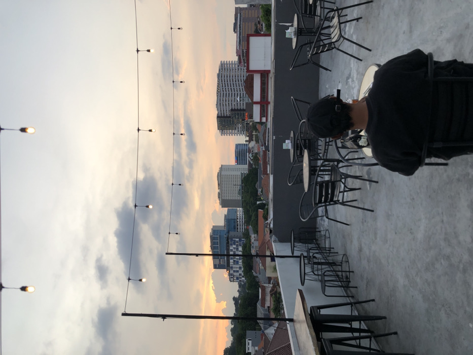 A rooftop cafe in Semarang, Indonesia, is depicted at dusk, overlooking the city skyline