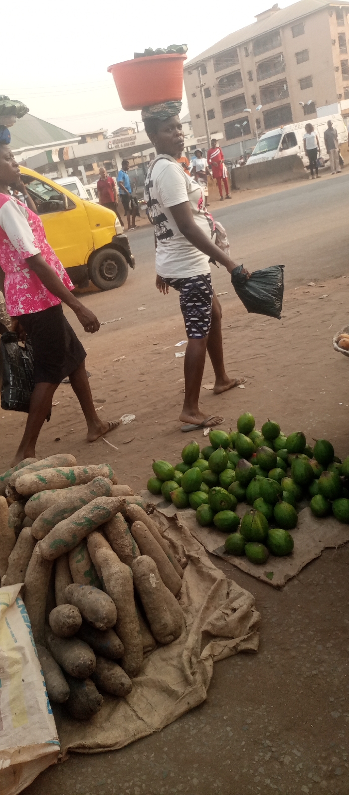 The image depicts a street market scene in Nkpor, Nigeria, captured during daylight hours. In the foreground, two distinct piles of produce are displayed on the ground, both resting on burlap sacks. To the left, a large quantity of elongated, light-brown root vegetables, identifiable as yams, is stacked. Some yams exhibit green markings. To the right, a mound of green, oval to round fruits is visible. A white and blue striped woven bag is partially visible on the far left edge of the frame. Two women are prominent in the midground, walking from left to right. The woman on the left wears a pink and white patterned short-sleeved top and a dark skirt, carrying a black bag in her left hand. Her feet appear bare. The woman in the center, facing forward towards the viewer, balances a large orange basin on her head, supported by a patterned cloth. She wears a white t-shirt with a dark graphic on the back, dark patterned shorts, and light-colored flip-flops, holding a black plastic bag in her right hand. In the background, a paved road is visible, with multiple pedestrians and vehicles. A yellow compact vehicle is partially visible behind the first woman. Further down the road, a white van is parked. Several other individuals are visible walking or standing on the roadside. Multi-story buildings line the street, including one with prominent balconies. A sign displaying "SUNCRUSH OIL & GAS LTD" is visible on a building. The sky is hazy, indicating an outdoor setting. The ground surface in the foreground and midground is primarily dirt or unpaved earth.