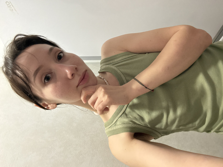 An adult female is depicted in a close-up, frontal portrait, positioned in an indoor setting. She has dark brown hair, pulled back, and fair skin with visible minor imperfections. The subject wears a light olive green ribbed tank top. Accessories include a light-colored beaded necklace around her neck and a thin black string bracelet with a small red element on her right wrist. Her right hand is raised, with fingers resting against her chin or jawline. She gazes directly at the camera with a subtle expression. The background consists of a light grey, possibly textured wall on the left, and a smooth, white vertical surface on the right. A partial "beko" logo is visible in the upper right corner of the white surface, indicating the presence of an appliance or furnishing from that brand. The lighting suggests an interior, possibly artificial, source. The exact location within the city of Novi Sad, Serbia, cannot be determined from the visual evidence provided.