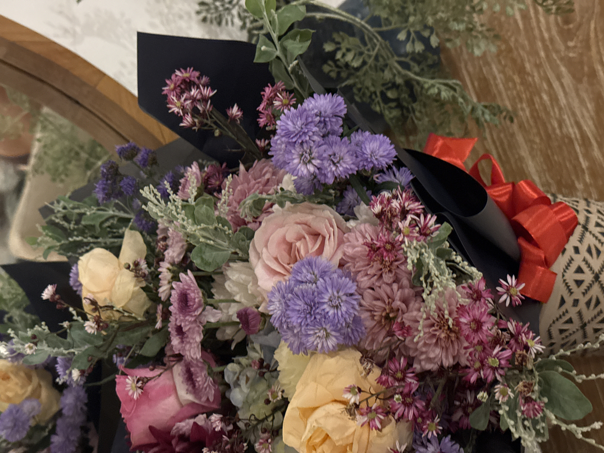 A close-up shot depicts a bouquet of flowers. Predominantly, the bouquet consists of pink, purple, and yellow blossoms. The flowers are wrapped in dark navy paper and tied with a bright red ribbon. Green foliage accents the arrangement. The backdrop is a wooden surface. This scene is in North Kuta, Indonesia.