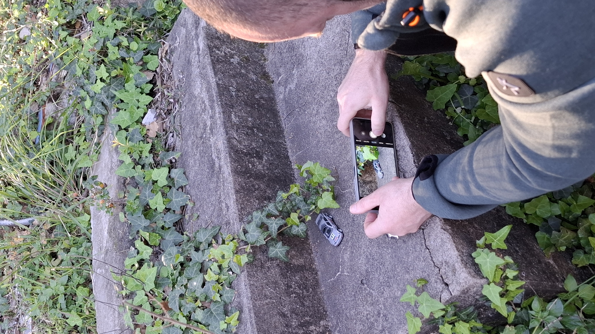 A man is taking a picture with his cell phone of a toy car on a concrete staircase. The toy car, silver in color with the number 87, is on a step covered with ivy. The man is wearing a green jacket. The location is Podbadac, Montenegro.