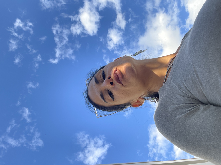 The image depicts a female individual outdoors at Aeropuerto Internacional Ezeiza, Argentina, captured from a low-angle perspective looking upwards towards her
