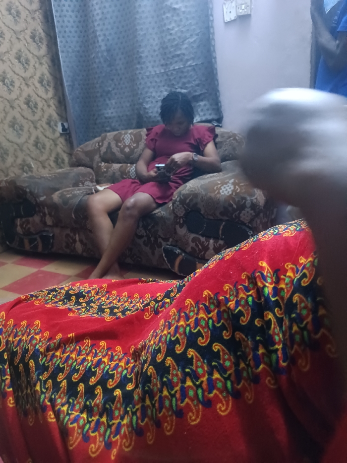 An indoor scene features two couches. A woman wearing a red dress sits on a brown patterned couch, looking at her phone. The foreground shows a red blanket with a colorful paisley pattern draped over another couch. Part of a person in a blue shirt is visible in the upper right corner. The background includes patterned wallpaper and a blue curtain. An electrical outlet is mounted on the wall.