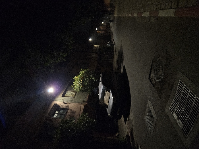 At night, a street with a car parked along the side. A building with a light above it, and trees around it. Drain covers and street markings are visible. The image is grainy and dark.