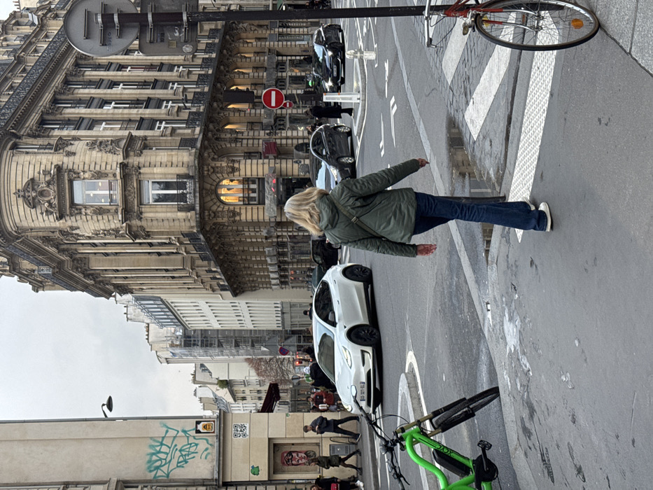 The scene depicts a busy urban street intersection in Paris, France, under an overcast sky. In the immediate foreground, a person with shoulder-length blonde/grey hair, wearing a dark green puffer jacket, blue flared jeans, and white sneakers, walks away from the camera on a wet paved sidewalk, heading towards a crosswalk. A tan cross-body bag is visible over their jacket. To the left, a bright green electric bicycle with a visible battery pack is parked. To the right, the front wheel and handlebars of a red conventional bicycle are partially visible, parked near a pole. The midground features a multi-lane street intersection with several vehicles. A prominent white Tesla Model Y, bearing French license plates (ED-321-QL), is in the process of navigating the intersection, appearing to be turning left or proceeding straight. Multiple dark-colored vehicles, including sedans and hatchbacks, are also present, some stationary, some in motion. A lone pedestrian stands on a concrete median strip in the middle of the street. A red circular "No Entry" traffic sign is affixed to a pole on the right side of the street. The background is dominated by characteristic Parisian Haussmannian architecture. A large, ornate, light-colored stone building with multiple floors, intricate carvings, balconies, and large windows occupies the right side of the frame, forming the corner of the street. Its ground floor houses businesses with illuminated interiors. To the left, a plainer building features green spray paint graffiti, a yellow rectangular sticker, a QR code, and a poster with a stylized face. A black street lamp extends from this building. Further down the street, additional Parisian buildings, one with scaffolding, are visible beneath a uniformly grey, overcast sky.
