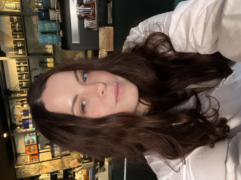 A female individual is centrally framed in a close-up portrait, likely a selfie, within an indoor commercial establishment